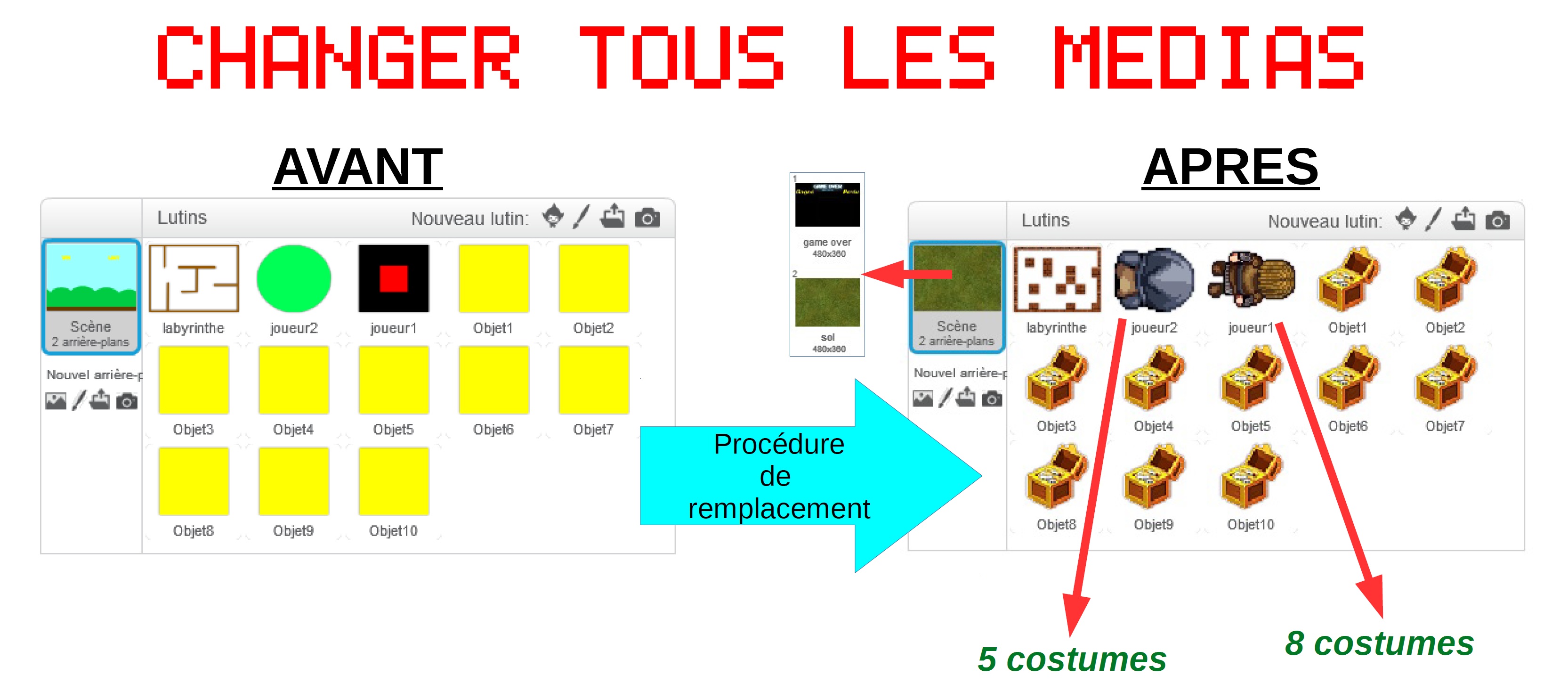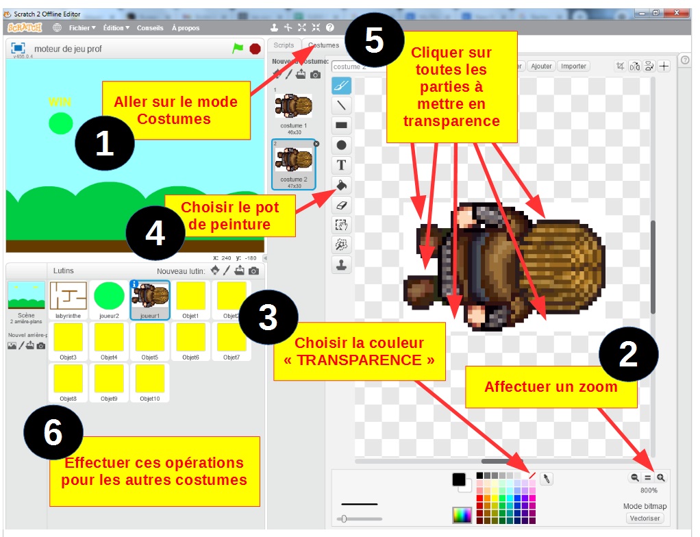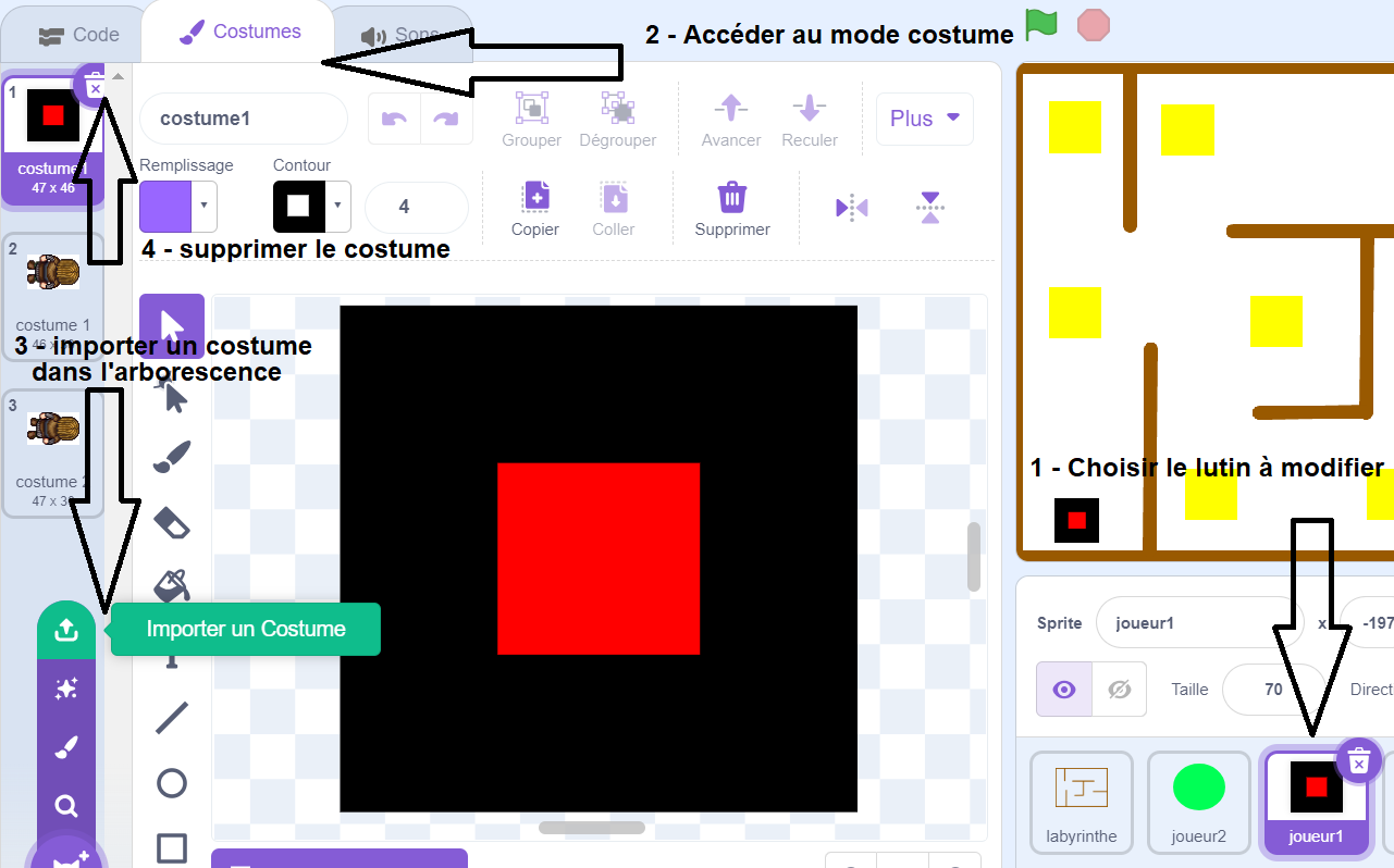 e) Faire apparaître l'arborescence des dossiers tel qu'il apparaît dans le cadre rouge de l'image ci-dessous : ![]() Compléter l'arborescence sur la fiche élève. N'oublier pas de noter votre nom, prénom et classe. Rendez le travail à votre professeur. Etape 6 : a) Intégrer les nouveaux média au jeu ![]() b) A partir de Scratch en ligne : Dans le fichier classé "moteur de jeu Prof" (ou bien le votre), remplacer TOUS les divers médias par ceux stockés auparavant (procédure ci-dessous). ![]() ![]() Tester le jeu et présenter le résultat à votre professeur. c) Améliorer le graphisme des lutins: