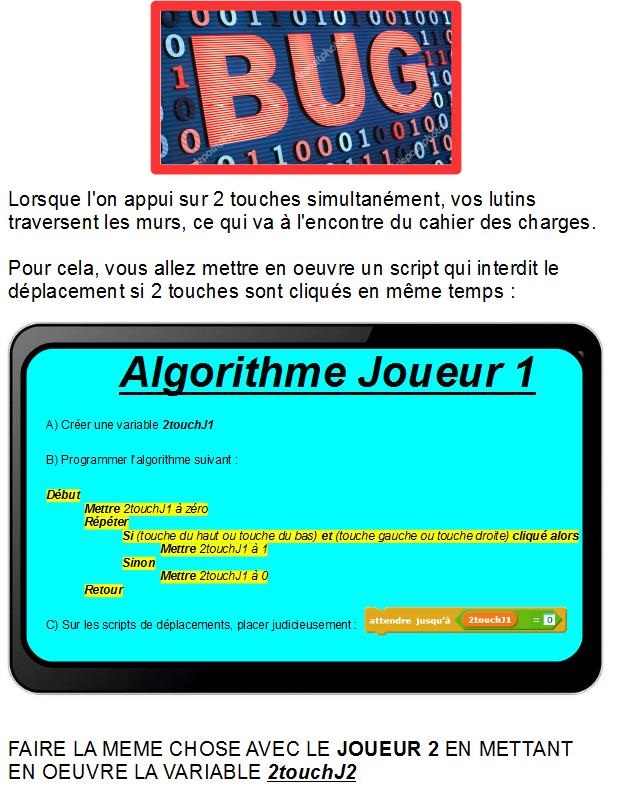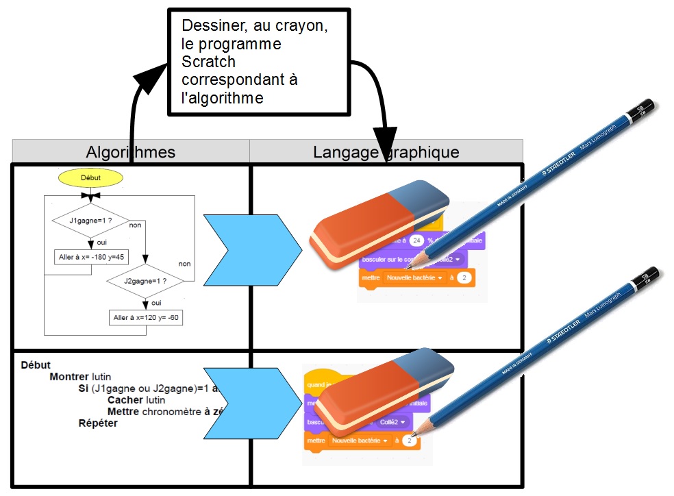 b) Agencer les divers bloc de chaque lutin en suivant le fichier suivant : ![]() Présenter votre travail au professeur. Etape 3 : a) Dessinez au crayon sur la fiche élève le programme Scratch correspondant à l'algorithme
