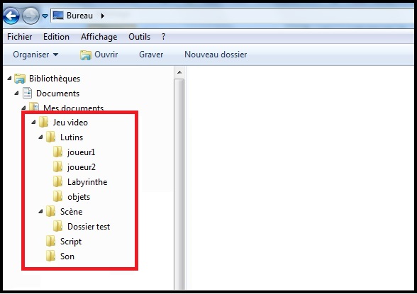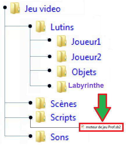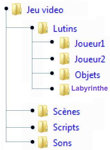 Accéder à votre espace Documents : ![]() Créer, dans votre espace de travail (Dossier Documents) un dossier "Jeu vidéo" dans lequel vous créerez divers sous-dossiers, décrits dans l'arborescence ci-dessous. ![]() Explication : le sous-dossier Joueur1 se trouve dans le sous-dossier Lutins, lui-même stocké dans le dossier Jeu vidéo