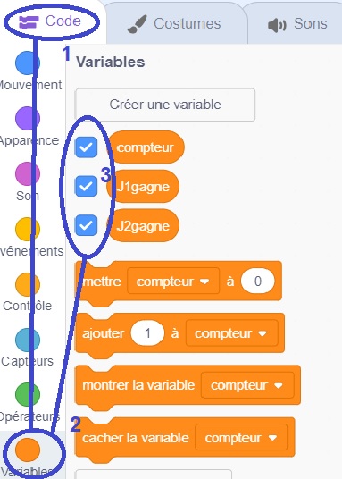a) Télécharger et lancer le logiciel scratch suivant : lien b) Faire apparaître les variables (données) du jeu et compléter le tableau sur la fiche élève : ![]() Confirmer vos réponses en complétant le QCM sur quiziniere : ![]() c) La vitesse du joueur 2 doit augmenter de +1 à chaque fois que le joueur 1 s'empare d'un objet" Programmer le jeu afin de répondre à la contrainte ci-dessus