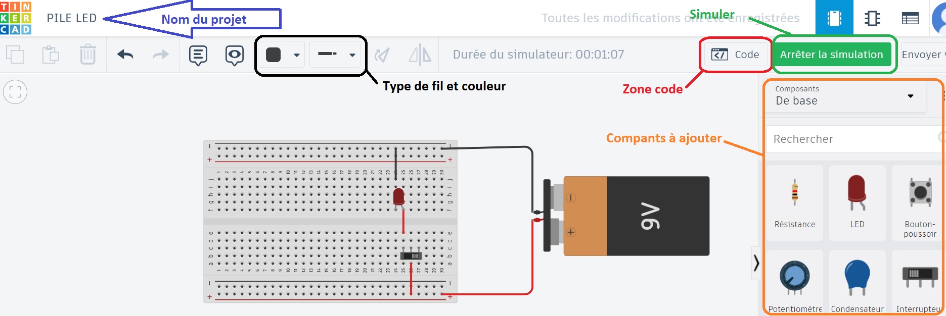 Indication :Créez un nouveau Circuit et le nommer PILE + LEDen suivant le chemin dans TinkerCad : Puis réaliser le circuit suivant :